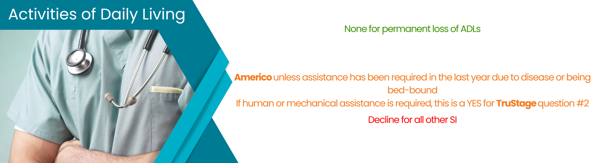 | Americo | Decline if PI has required assistance with ADLs in the last 12 months because of a disease or being bed-bound |