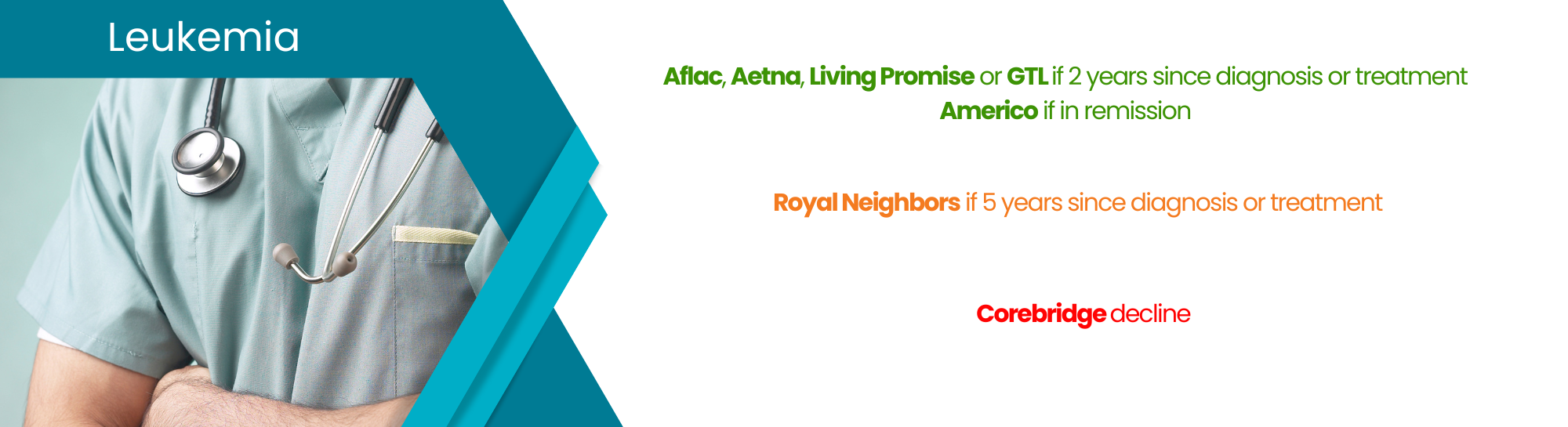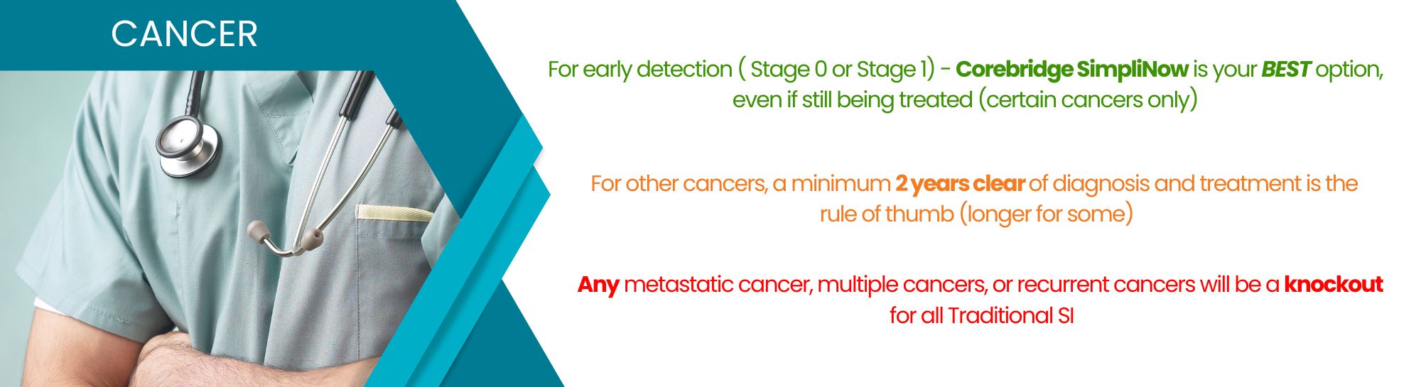 | Corebridge | Decline for any cancers Stage 3 or beyond, or multiple occurrences of cancer EVER Decline for any Stage 2 cancers within the past 4 years Eligible for Level coverage with the following Stage 0 or Stage 1 cancers: