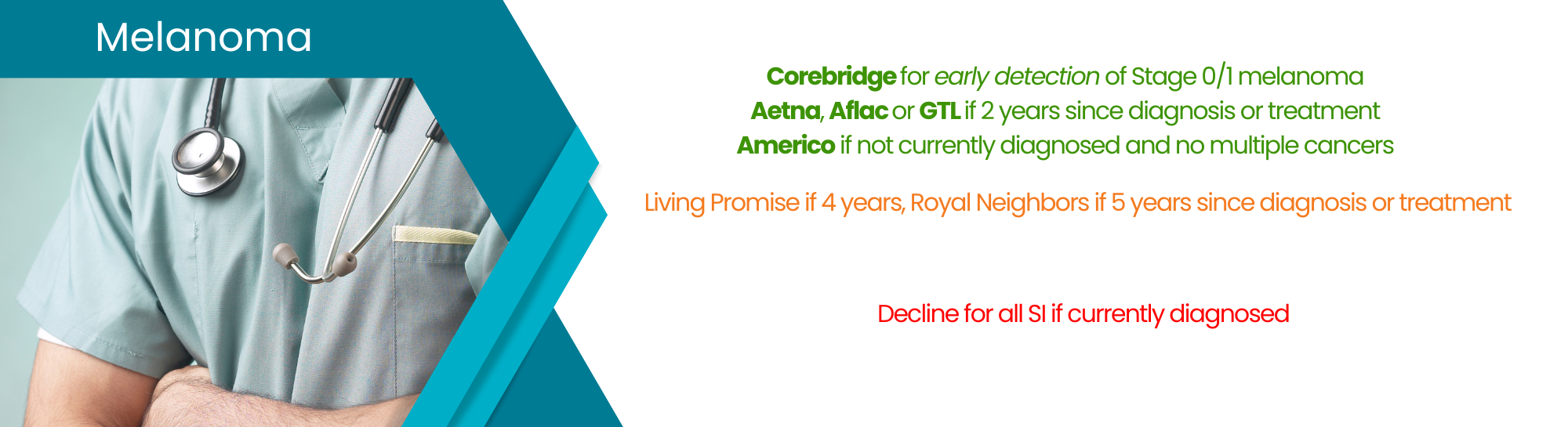 | Corebridge | Decline if Stage 2 or above or for recurrent Melanomas |