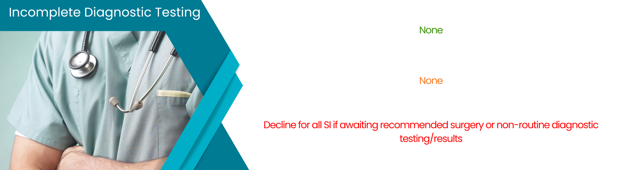| Corebridge | Decline if in the last 12 months the PI has been advised to have diagnostic testing (other than for routine purposes) which has not been done or for which the results are not known. |