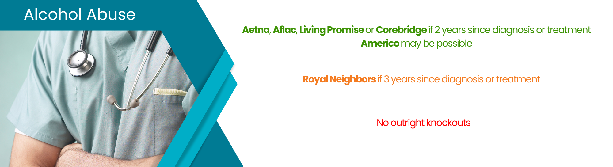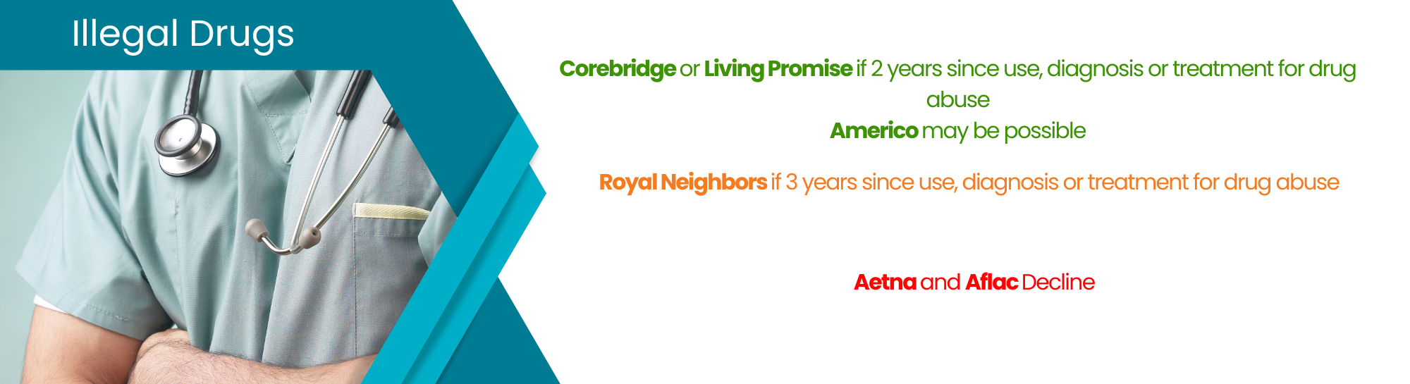 | Royal Neighbors | Declined if diagnosed or treated for drug abuse in the last 3 years |