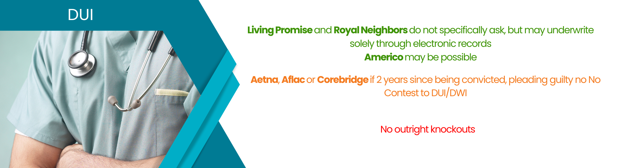 | TransAmerica | Decline if convicted of, pled guilty or no contest to DUI/DWI in the last 2 years |