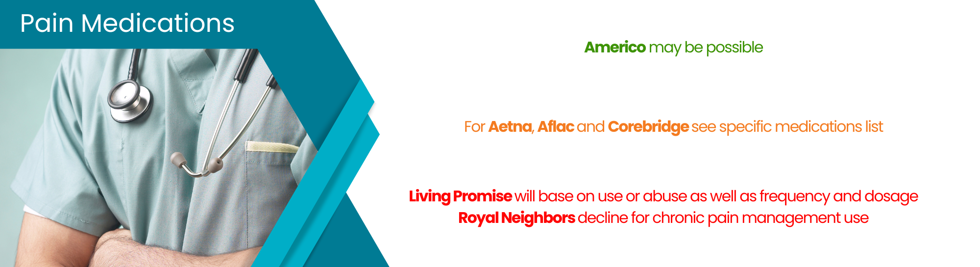 | TransAmerica | Chronic pain is allowed, see medications list for specific concerns |