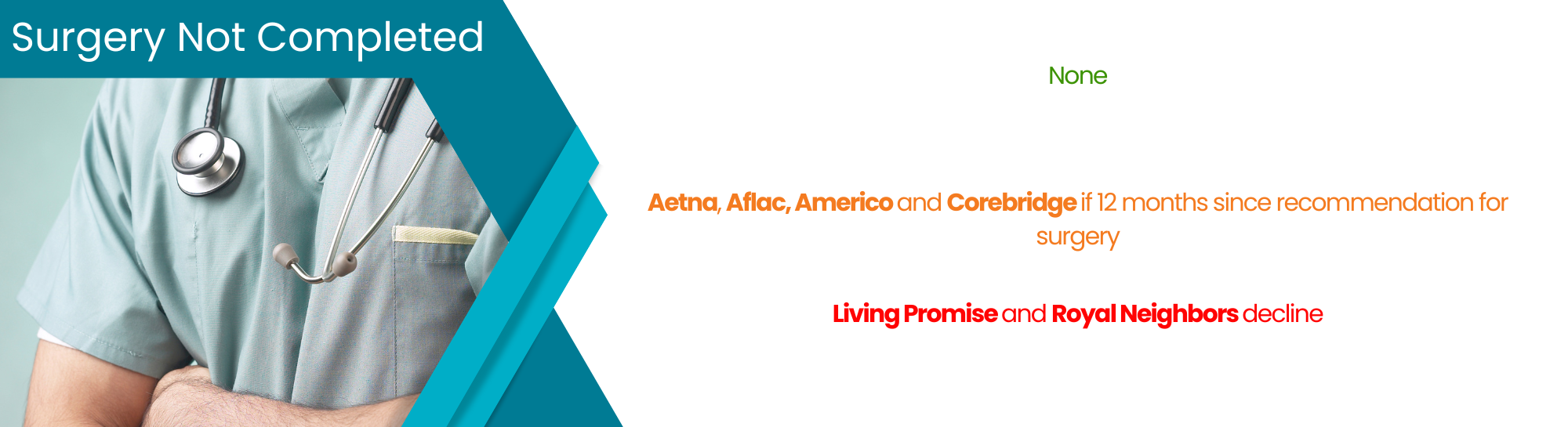 | TransAmerica | Decline if recommended to have surgery which has not been completed in the last 6 months |