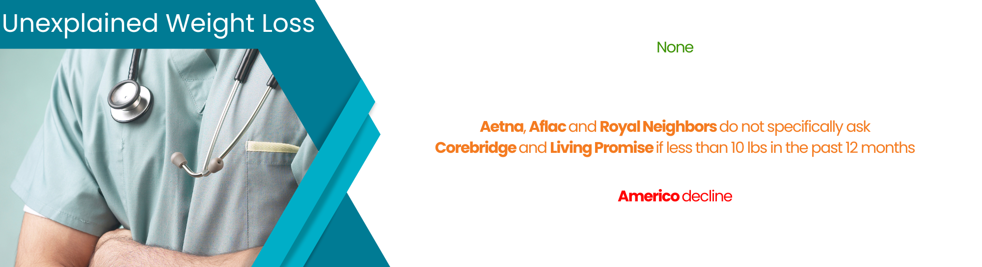 | Corebridge | Decline for unexpected or unintentional weight loss in excess of 10 lbs within the last 12 months |